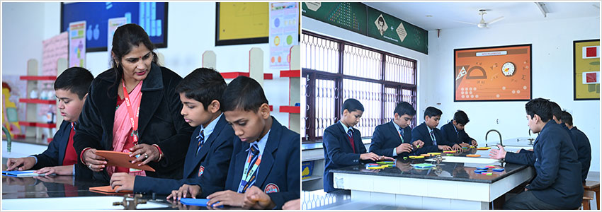 It creates an environment that is student centered. It is all about learning, verifying and visualizing mathematical concepts in a ‘fun’ way. It inculcates learning through ‘applied reasoning’. This learner centered approach to Maths helps every child imagine, investigate and interact effectively. The multiple teaching and learning aids comprise of technology, application videos, manipulator and measuring instruments, tables, charts and much more.